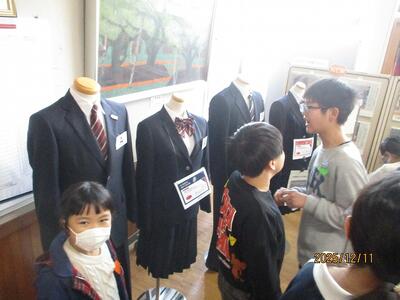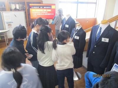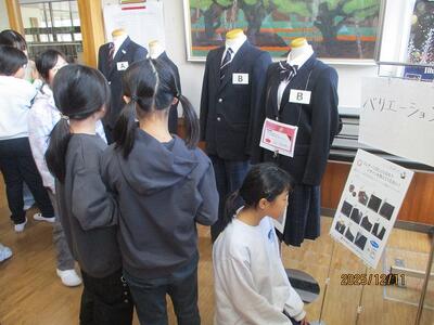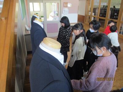 今日の朝、学校に新中学校の制服展示のマネキンが届いています。中間休みから、子どもたちは嬉々として品定め。
