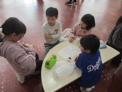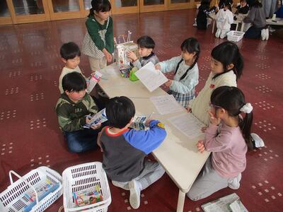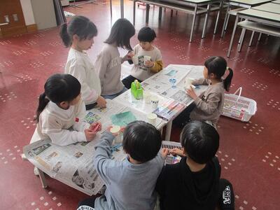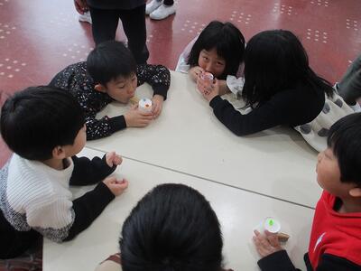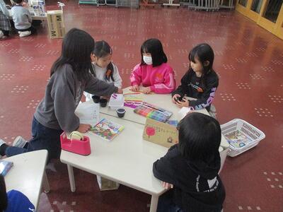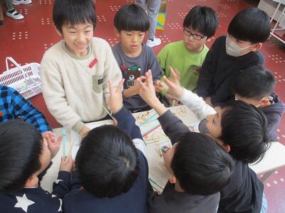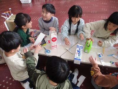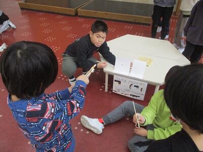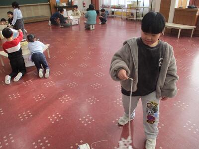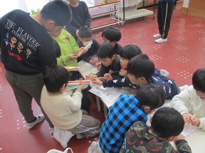 でも、それだけではありませんでした。後半戦は、1年生に作り方を教えて、実際に作って遊んでもらうと。これはいいですね!1年生と2年生、頭を寄せ合い、しっかり話を聞いてがんばりました!