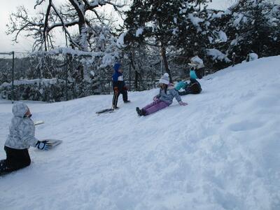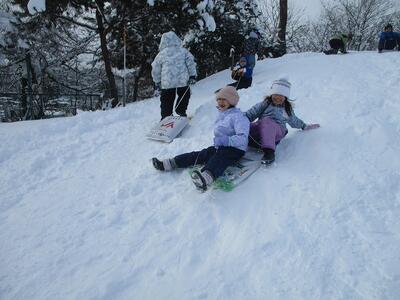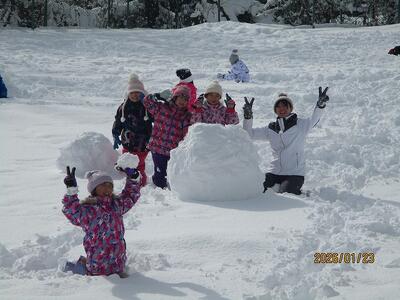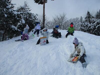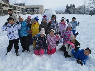 1年生は昨日の天気とは打って変わった穏やかな天候の中、雪遊びに興じました。グラウンドには何とも大きな雪だるまが出現!!