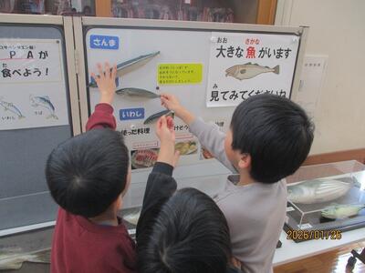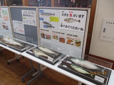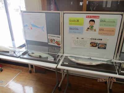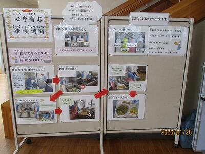 今日から本校では、給食週間に入ります。昇降口にはたくさんの掲示物。いつもは見ることのできないものがたくさんあります。見たり触ったりしながら、「食」への関心を高めてほしいという担当からの願いです。