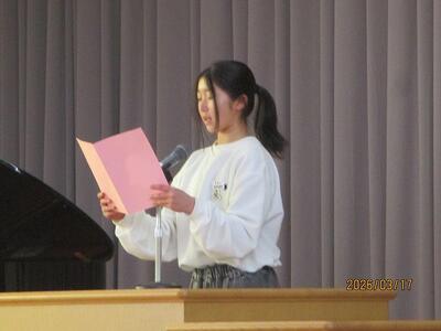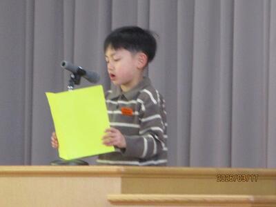 この一年間、たくさん挑戦してきました。まずは運動会。組頭として悩んだ時もありましたが、荒木先生から「組頭としてやらなければならないことは?」と声をかけられたことがきっかけで、考え直し、決意を固めて取り組むことができました。二つ目は6年生としての自覚。今までは先輩方がしてくれていたけれど、今年はそうはいきません。「前に踏み出す力」で勇気をもって注意したりまとめたりすることができました。私の挑戦はこれからも続きます。(部分抜粋)