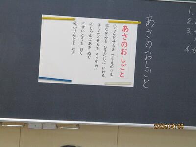 そしてピッカピカの1年生。「自分のことは自分で!」朝の準備の仕方をみんなで確認していました!(残念ですが後ろ姿で。来週から出していきます!)