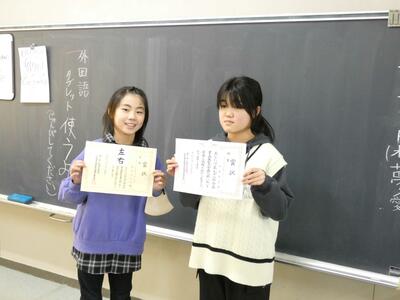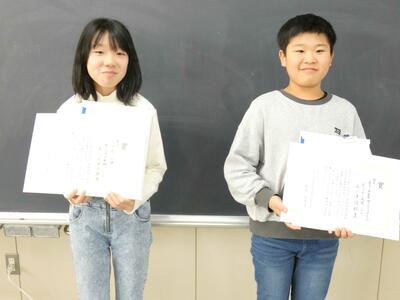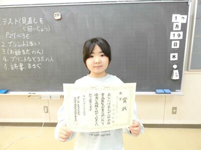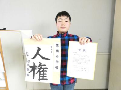 1つ目は、「寒河江・西村山地区小学生人権書道コンテスト」で優秀賞に輝いて友だちです。「人権」という文字をのびのびと書けましたね。