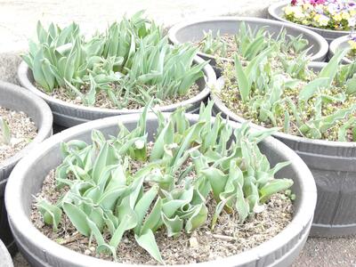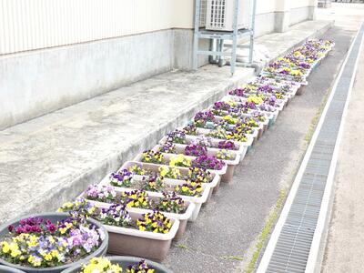 雪が解けたら、プランターや花壇のパンジーやチューリップの芽が顔を出しました。もう少ししたら昇降口などに飾られます。今は、出番を待っているようですね。