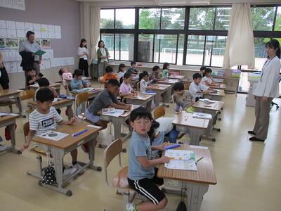 6年生が修学旅行の間、最高学年として頑張ってくれていた5年生。外国語を学んでいます!こちらは、4年生の秋山先生(英語専門)がきょうから授業をしています!