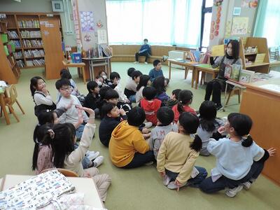 1の2は図書室で読み聞かせ。どっぷり「なべぶぎょう」のお話に聞き入っていました。