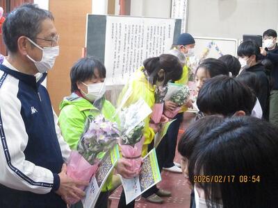 6年生から在校生へプレゼント。代表で実行委員長が受け取りました。