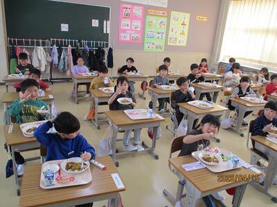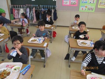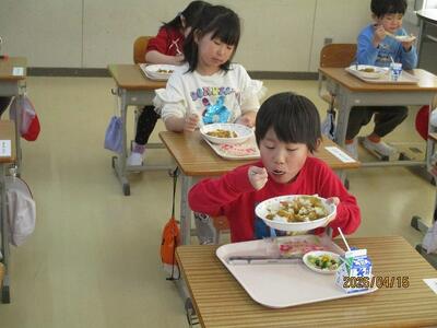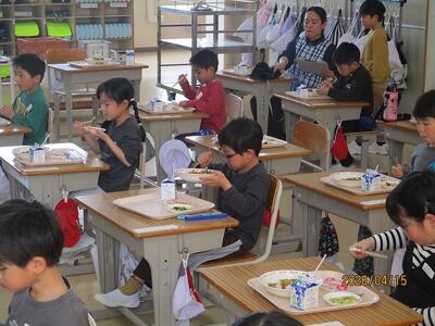 そして今日は、2年生以上の初給食。そぼろ丼。おいしいデザートも!